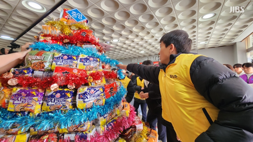 크리스마스를 앞두고 제주 중앙중학교 학생들이 어려운 이웃을 돕기 위해 십시일반 모은 라면으로 만들어졌습니다.