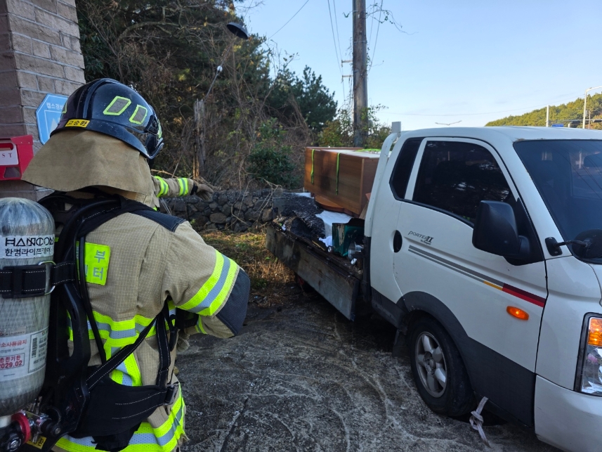 제주소방안전본부에 따르면 어제(28일) 오전 10시쯤 서귀포시 표선면 한 도로에서, 주행 중이던 화물차량에서 불이 났다는 신고가 접수됐습니다.
