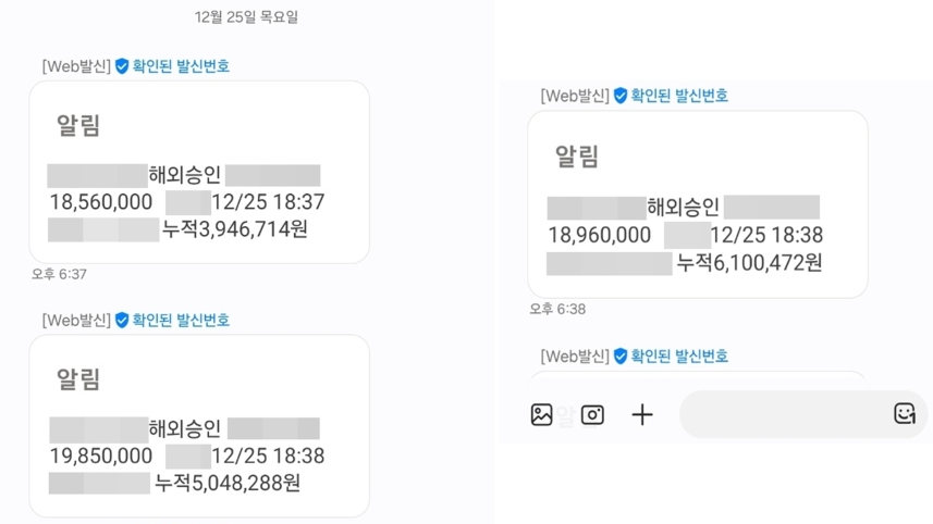 피해 여성 가족은 "몇 분 만에 단순 1~2만 원이 아니라 수백만 원이 해외에서 결제됐다"며 "추가로 천만 원단위의 결제 시도가 있었지만 다행히 카드 이용이 정지됐다"고 말했습니다.