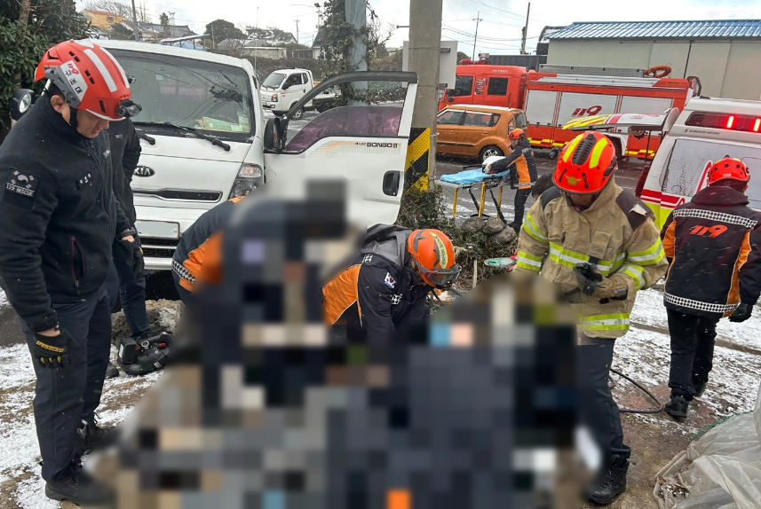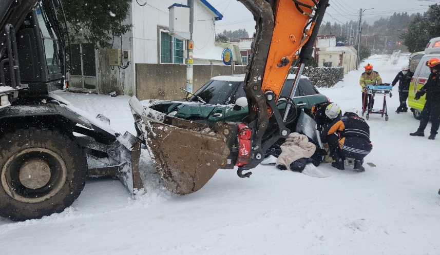 제주소방안전본부에 따르면 오늘(2일) 오전 10시 7분쯤 제주시 조천읍에서 차량과 굴삭기가 눈길에 부딪히는 사고가 발생했습니다.