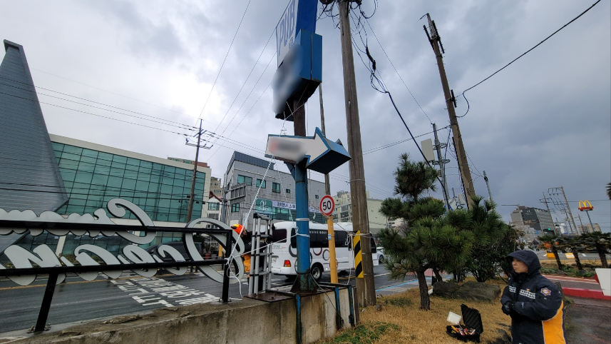 오늘(2일) 오후 제주시 외도동에서 강풍에 간판이 바람에 날린다는 신고로 안전조치가 이뤄지는 모습 (제주소방안전본부 제공)