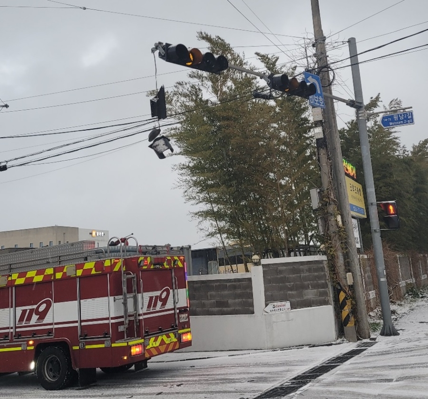 오늘(2일) 아침 제주시 도남동에서 신호등이 파손돼 안전조치가 이뤄지는 모습 (제주소방안전본부 제공)