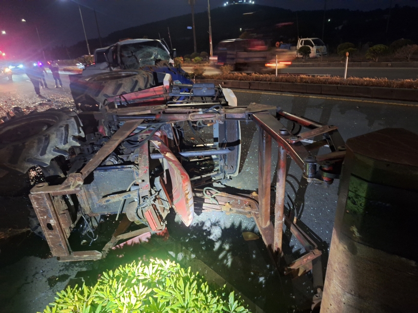오늘(13일) 아침 서귀포시 대정읍 인성리에서 발생한 트럭-트랙터 추돌 사고 현장 (제주소방안전본부 제공)