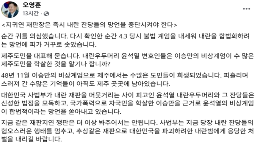 이어 "지귀연 재판장은 내란 잔당들의 망언을 중단시켜야 한다"며 "내란 우두머리 윤석열 변호인들은 이승만의 비상계엄이 수많은 도민을 학살한 것을 알기나 하나"라고 되물었습니다.