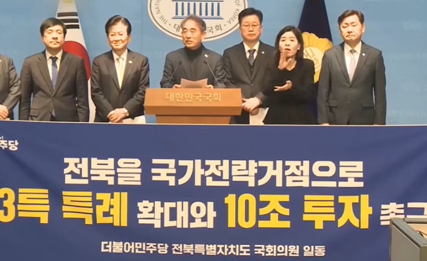 전북 국회의원들은 지난 4일 국회 소통관에서 합동 기자회견을 열고 3특 특례 확대와 10조원 규모의 국가 투자를 정부와 국회에 촉구했습니다.