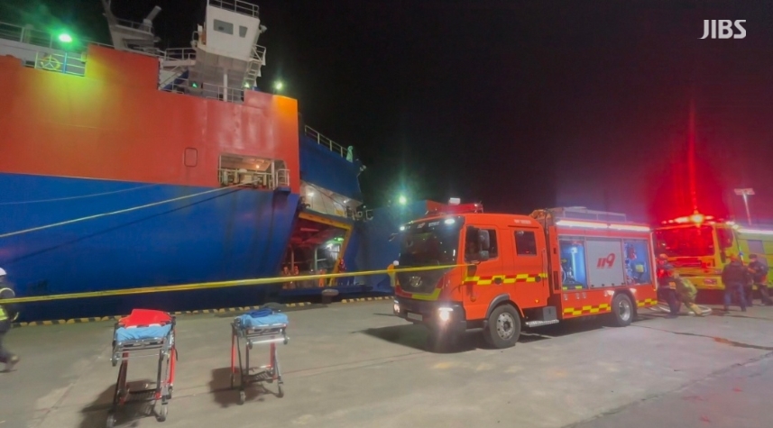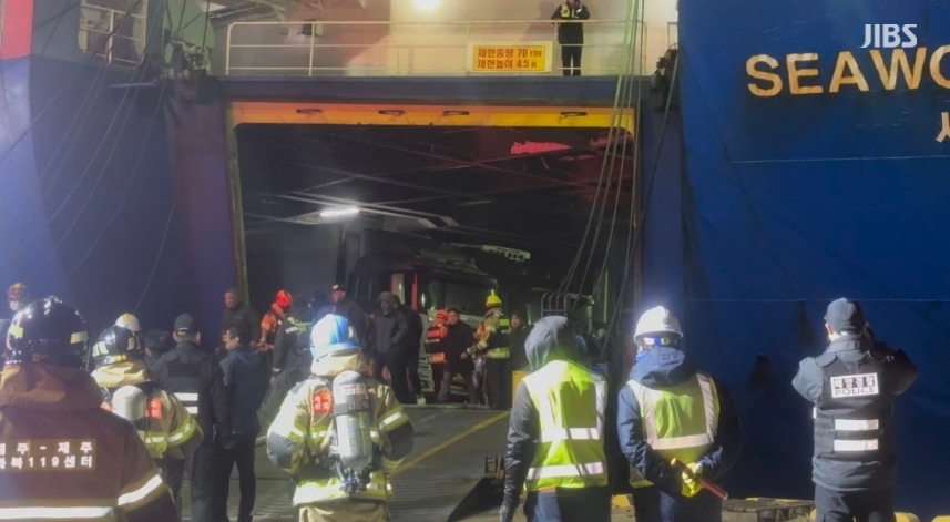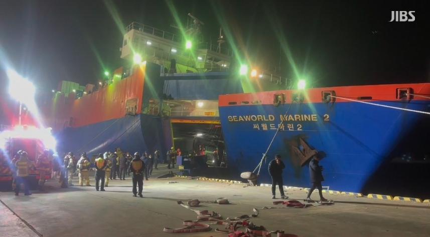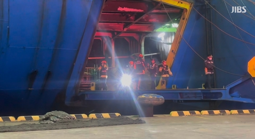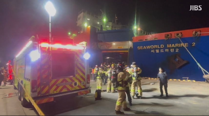 이 과정에서 화물선 내 차량 3대가 일부 불에 탔고, 선원 4명이 연기를 마셔 병원으로 옮겨졌습니다.