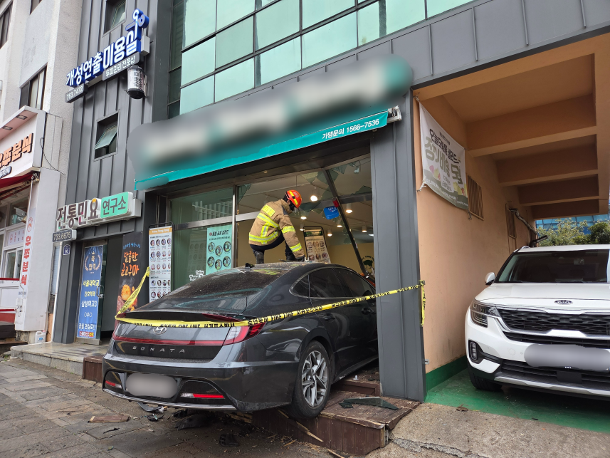 사고 차량 차체가 음식점 안으로 절반 이상 들어갈 정도로 강하게 돌진하면서, 해당 가게는 외부 유리벽과 내부 집기 등이 파손되는 재산 피해가 났습니다.