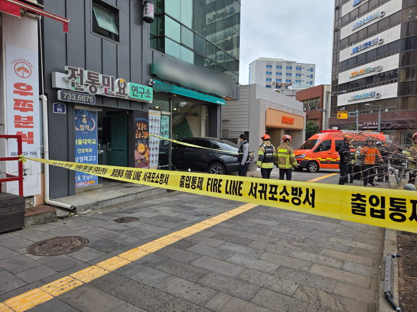 오늘(26일) 오전 서귀포시 서귀동에서 발생한 차량 돌진 사고 현장 (제주소방안전본부 제공)