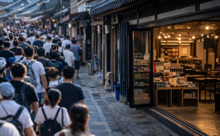 관광객이 몰린 거리와 달리 인근 상점은 한산한 모습을 보이며, 관광 수요와 지역 소비 간 격차가 나타나고 있다. (AI 생성 이미지)