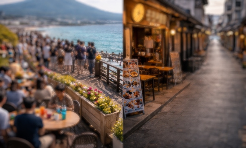 관광객이 몰린 관광지와 달리 인근 상권은 한산한 모습을 보이며, 제주 관광의 소비 불균형을 드러내고 있다. (AI 생성 이미지)