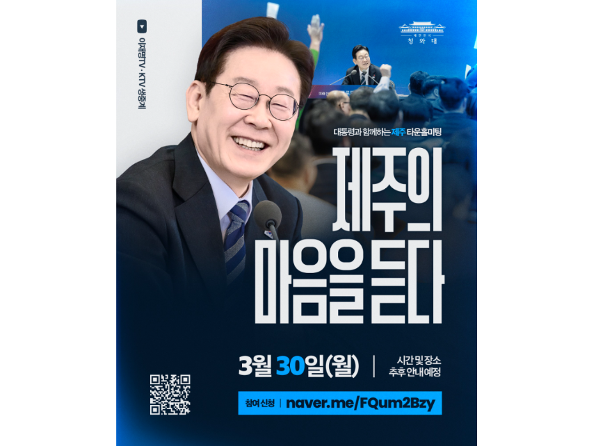 이 대통령은 오늘(22일) 자신의 SNS를 통해 "유채꽃 피는 따스한 봄날, 제주특별자치도에서 뵙겠다"며 오는 30일 제주 타운홀 미팅 개최를 알렸습니다.