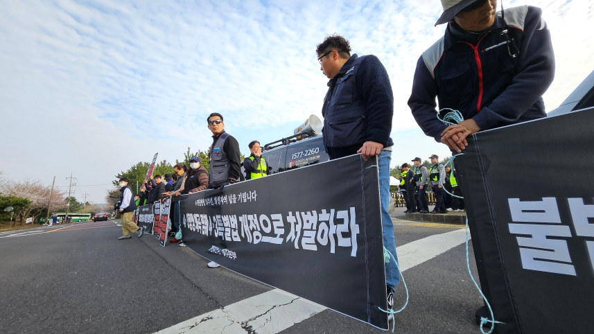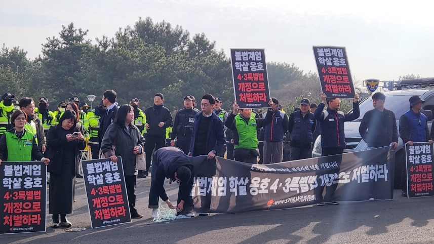 이들 4·3단체는 '불법계엄 학살옹호 4·3특별법 개정으로 처벌하라'는 피켓을 들고 제주한라경찰수련원 입구 주변에 자리했습니다.