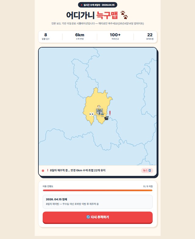 오늘(15일) '어디가니 늑구맵' 홈페이지에서는 늑구의 탈출 이후 이동 경로와 포획 경위 등이 담긴 정보를 확인할 수 있습니다. 늑구의 탈출 기간이 길어지면서 늑구의 무사 귀환을 바라는 많은 누리꾼이 해당 홈페이지에서 정보를 찾아보는 것으로 알려졌습니다.
