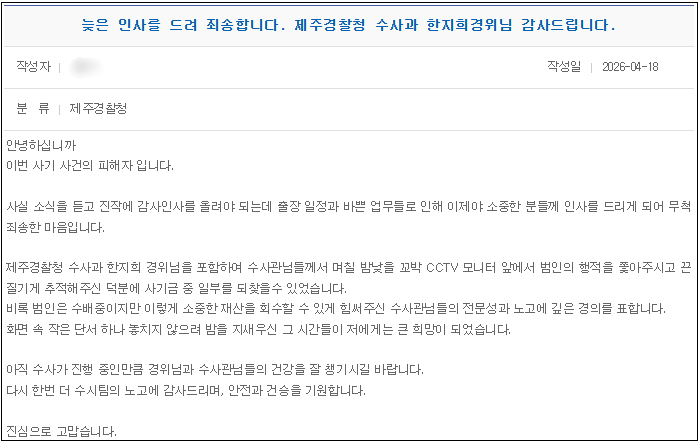 경찰의 대처로 피해금을 되찾은 A 씨는 제주경찰청 홈페이지에 감사글을 남겼습니다.