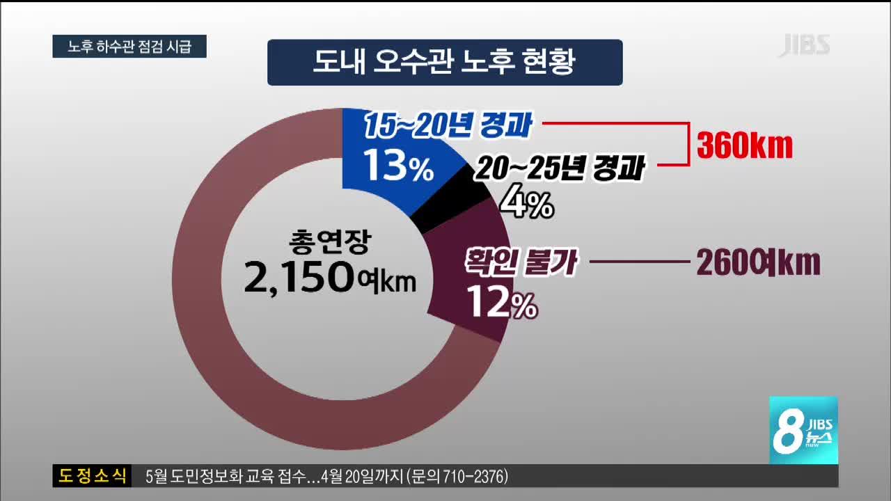 제주에 설치된 오수관 2150여 킬로미터 가운데 내구연한 20년을 넘었거나 내구연한 직전에 있는 하수관이 20% 가량인 360킬로미터가 넘습니다.