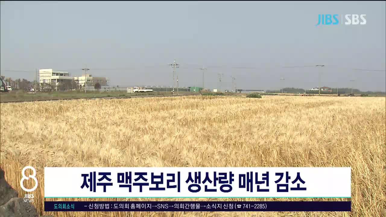 제주자치도에 따르면 2019년 맥주보리 생산량이 8.200여 톤에 이르렀지만 매년 감소하면서 지난해에는 7,100여 톤으로 줄었고, 재배 면적도 2019년 2,700여 ha에서 지난해 2,500여 ha로 줄었습니다.